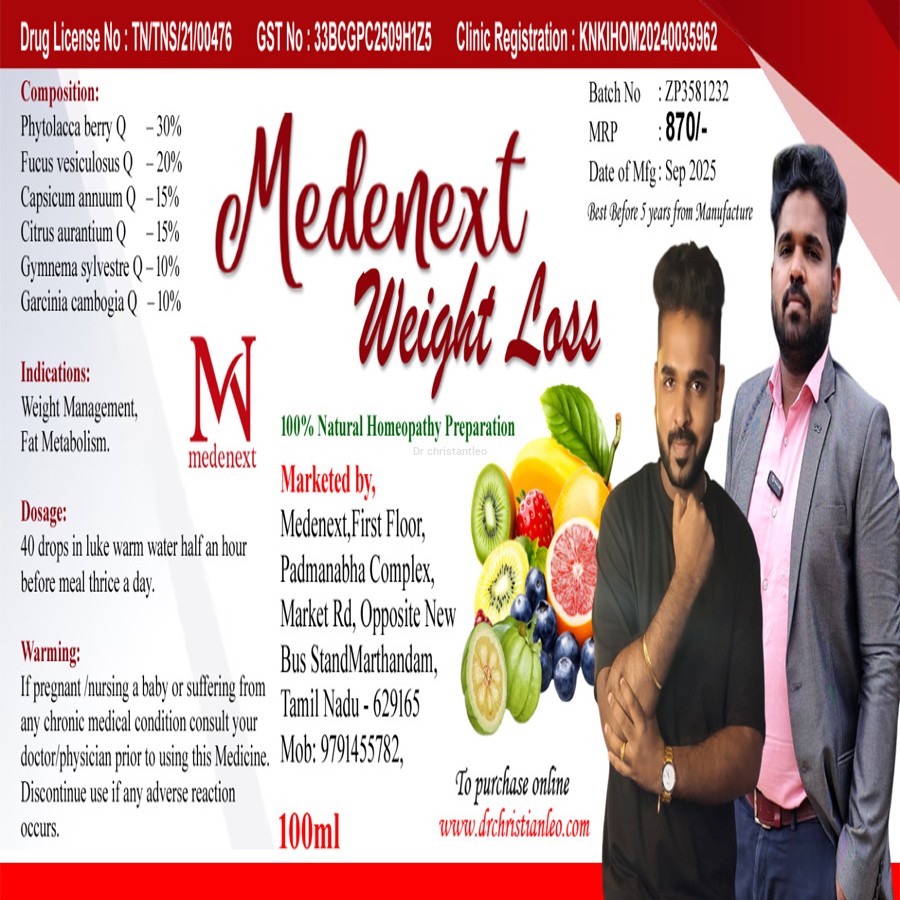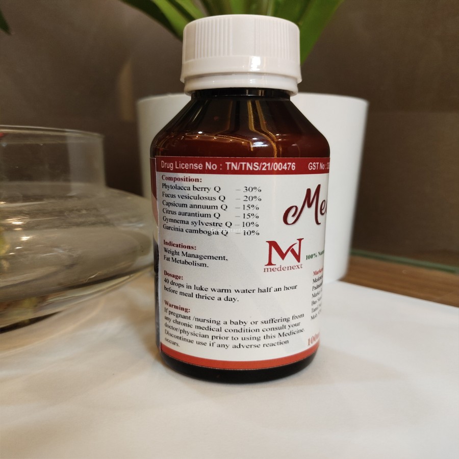 Medenext Weight Loss is a 100% natural homeopathic formulation designed to support weight management and fat metabolism. It helps in reducing excess body fat, boosting metabolism, and promoting a healthier body composition when combined with proper diet and exercise.